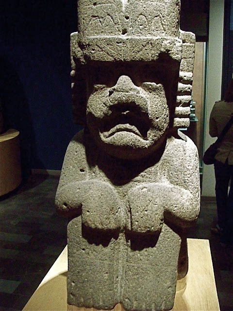 relieve de un personaje de origen olmeca que nos muestra su lengua bífida, sus orejas asemejan a las de un murciélago y de entre ambas, surge enroscada una